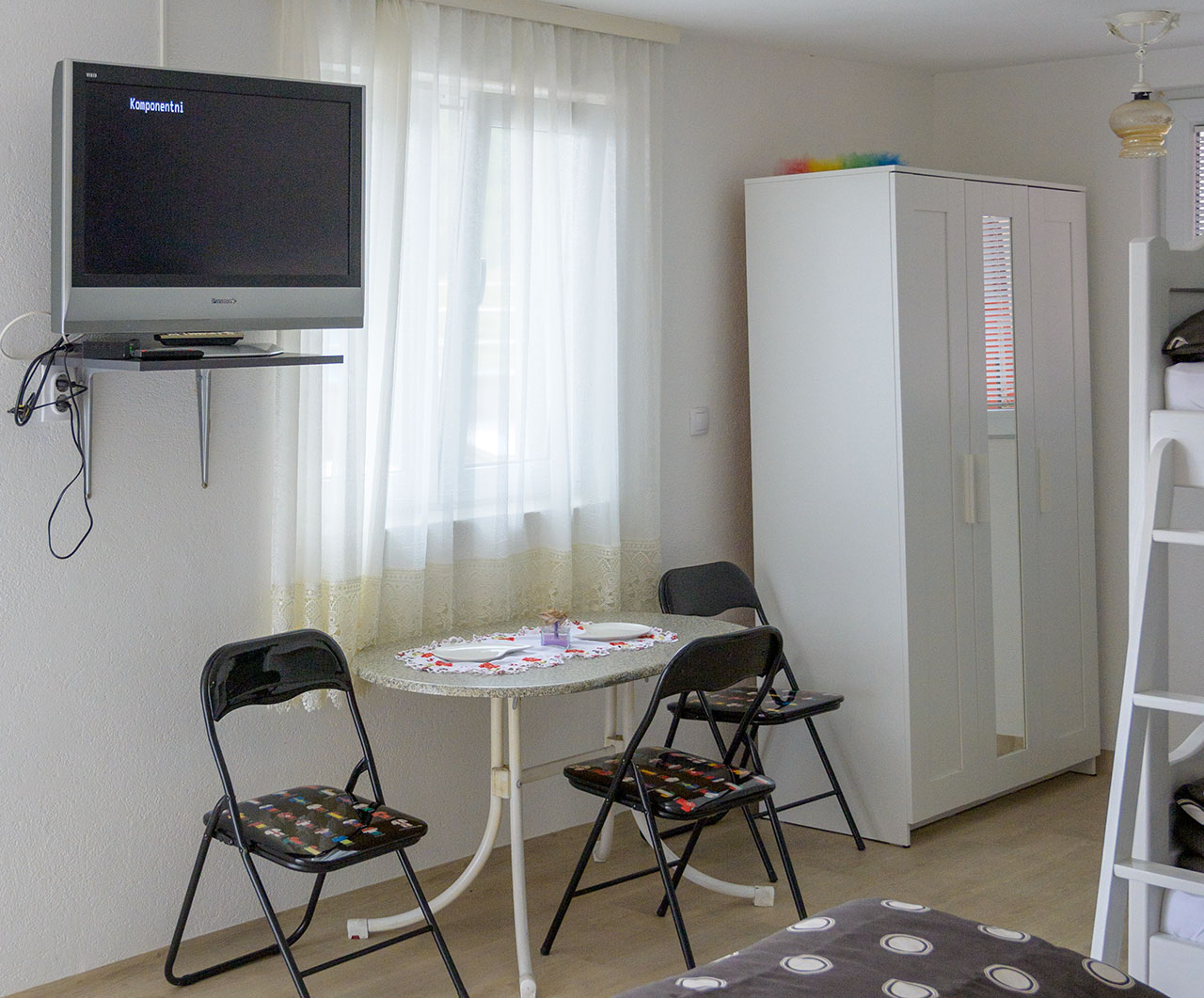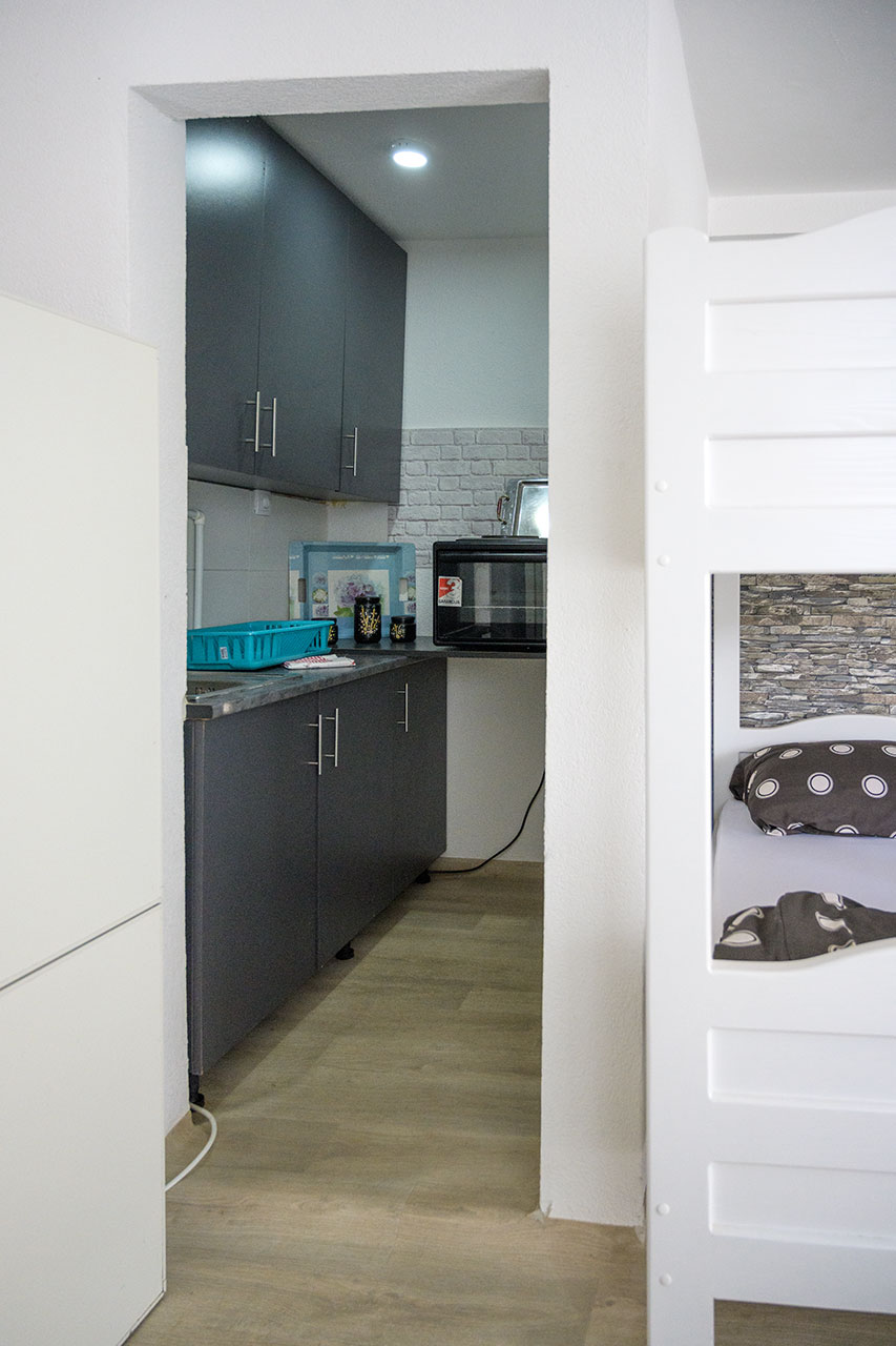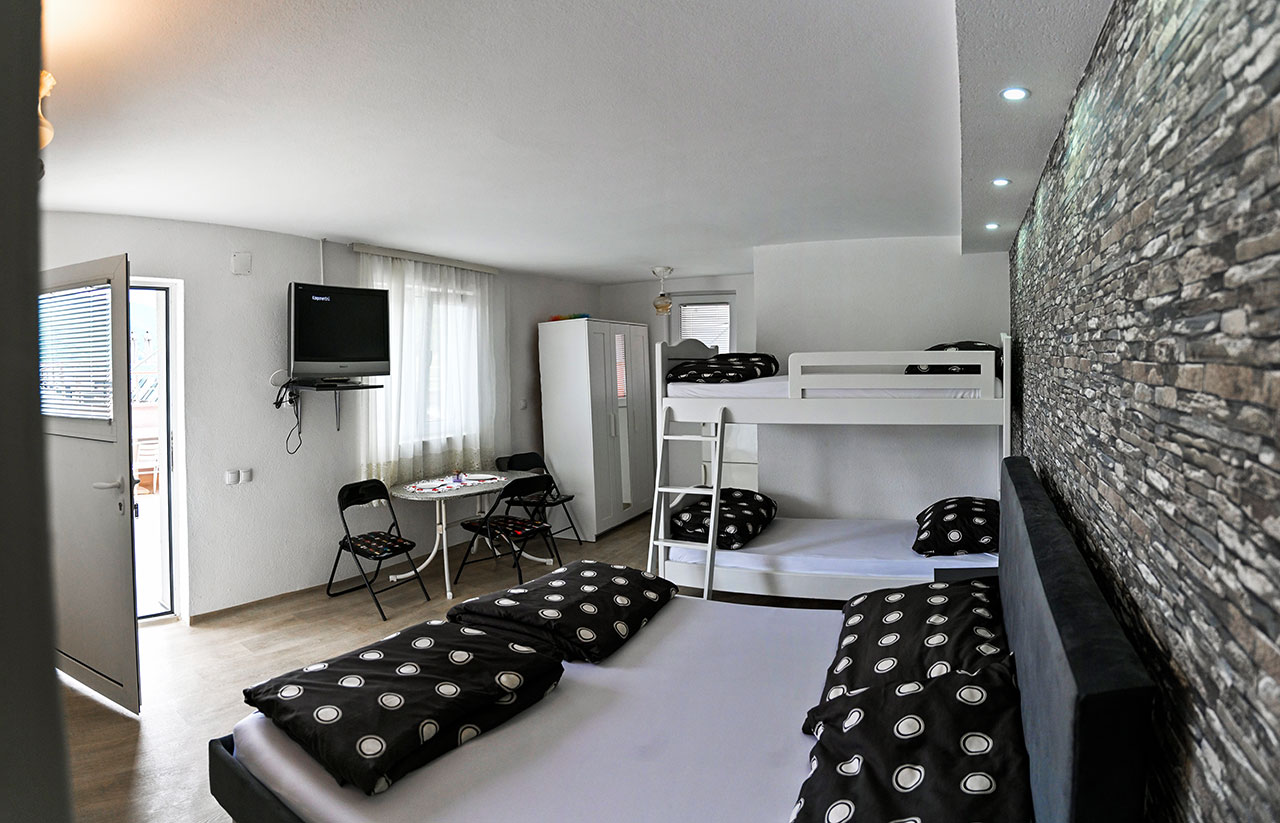 Sastoji se od velike sobe sa bračnim i dvospratnim krevetom, komodama, kuhinjskom nišom, garderoberom, stolom za obedovanje, televizorom, kao i sve što je neophodno za samostalno pripremanje hrane. Od frižidera sa zamrzivačem, do pribora, tanjira, šerpi...